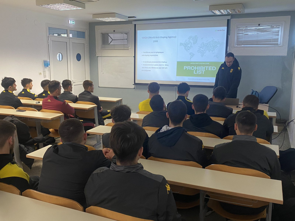 Στους ποδοσφαιριστές μίλησε ο Κώστας Αστεριάδης, ιατρός των τμημάτων υποδομής, ο οποίος αναφέρθηκε στο φαινόμενο της φαρμακοδιέγερσης, καθώς και στη λίστα των απαγορευμένων ουσιών.