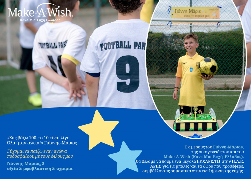 Ο Γιάννης-Μάριος είναι μόλις 7 ετών. Πάσχει από οξεία λεμφοβλαστική λευχαιμία. Η ευχή για τα γενέθλια του ήταν ένα πάρτι με θέμα την αγαπημένη του ομάδα, του ΑΡΗ. Έτσι ο ΑΡΗΣ αποφάσισε να κάνει την ευχή του μικρού μας φιλάθλου πραγματικότητα.