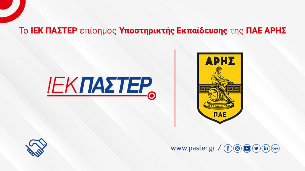 Το ΙΕΚ ΠΑΣΤΕΡ, στο πλαίσιο της στρατηγικής του για σύναψη συνεργασιών με διακεκριμένους επιστημονικούς και ερευνητικούς φορείς, που αποσκοπούν στην προαγωγή του εκπαιδευτικού, κοινωνικού και ερευνητικού του έργου, προχωρά σε μια σημαντική σύναψη συνεργασίας, με την ΠΑΕ ΑΡΗΣ.