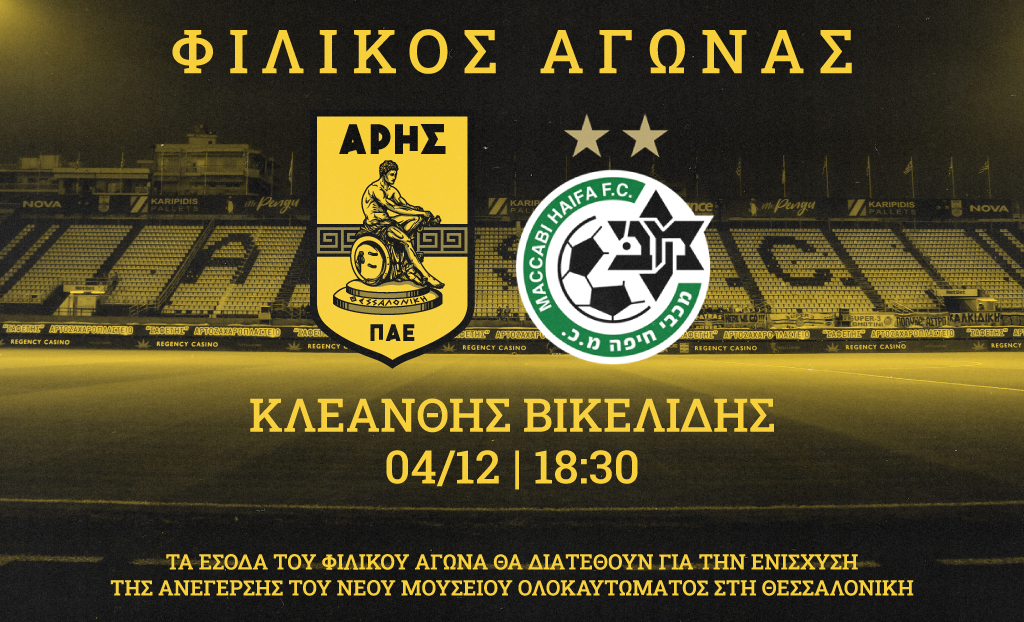 On Sunday, December 4, ARIS Thessaloniki F.C. welcomes to «Kleanthis Vikelidis» Stadium (18.30) the Israeli Champion, Maccabi Haifa F.C., in a charity international friendly football game.