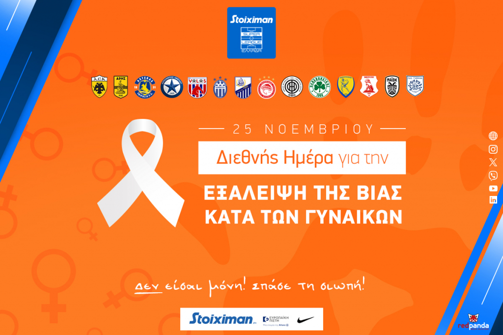 Με αφορμή τη διεθνή ημέρα (25/11) για την εξάλειψη της βίας κατά των γυναικών, καθώς και τα ανησυχητικά αυξανόμενα κρούσματα περιστατικών ενδοοικογενειακής βίας στην ελληνική κοινωνία, η Super League αφιερώνει τη 12η Αγωνιστική ημέρα του Πρωταθλήματος «Stoiximan Super League» στην ενημέρωση και την ευαισθητοποίηση της φίλαθλης κοινής γνώμης, για το σημαντικό αυτό ζήτημα.