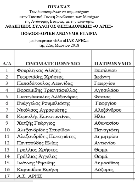 Στις 22 Μαρτίου και ώρα 20:00 θα πραγματοποιηθεί η Γενική Συνέλευση των μετόχων της ΠΑΕ ΑΡΗΣ.